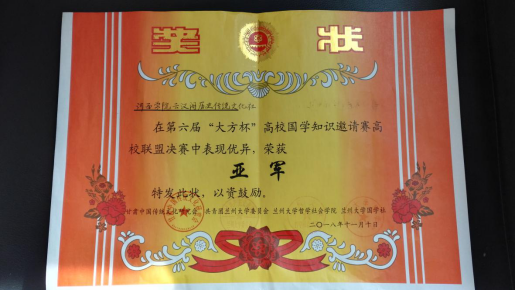 2018年11月10——11日,第六届“大方杯”高校国学知识邀请赛在兰州大学举行,来自武汉大学、四川大学、重庆大学、陕西师范大学、兰州大学、郑州大学、兰州交通大学等24所高校的选手参赛。经过激烈的比拼,兰州大学代表队获得冠军,beat365代表队和武汉大学代表队分获亚军和季军。beat365在线官网入口历史学专业白占强、医公司护理学专业董宁同学分别获得个人第二名。