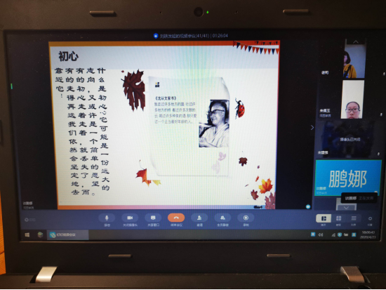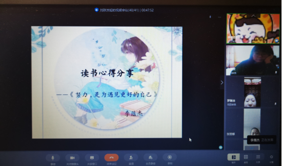 通过钉钉网络视频,员工党员韩瑞、白占强、李蕴杰、党周生、谈鹏娜5位同学结合平时的读书体会,分别同与会人员分享了《人一生要读的经典》、《治史三书》、《努力,是为遇见更好的自己》、《平凡的世界》和《活着》五部作品。在音乐、PPT画面和诗文中,同学们讲述着自己读书的心得和感受,讲述着在读书中的获得的乐趣和享受,同时也认识到读书的重要性和必要性。此次活动中,同学们所分享的书目以不同的体裁、方式和风格表达了同一个观点,那就是通过读书不断地努力去遇见更好的自己!