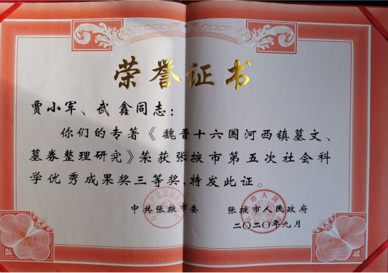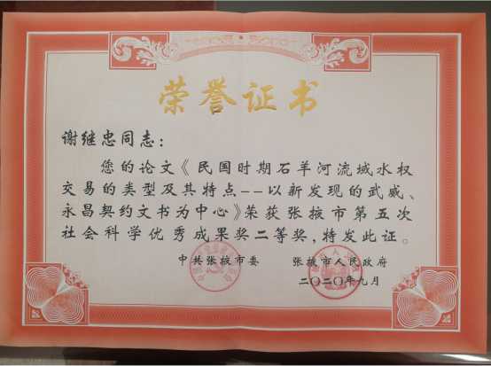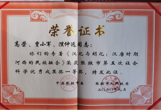 在张掖市第五次社会科学优秀成果奖获奖成果中,高荣教授、贾小军教授、濮仲远副教授合著的《汉化与胡化:汉唐时期河西的民族融合》荣获一等奖;谢继忠教授独立完成的学术论文《民国时期石羊河流域水权交易的类型及其特点——以新发现的武威、永昌契约文书为中心》荣获二等奖;贾小军教授、武鑫馆员合著的《魏晋十六国河西镇墓文、墓券整理研究》荣获三等奖。谢继忠教授、安玉军副教授参与完成的科研成果分别荣获一等奖和二等奖。