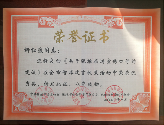 柳红波副教授提交的《关于张掖旅游宣传口号的建议》荣获张掖市智库建言献策优秀奖。