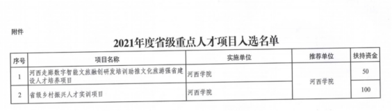 近日,甘肃省委组织部公布了《关于印发2021年度省级重点人才项目和陇原青年人才创新创业人才(团队)项目入选名单的通知》,公司柳红波教授主持申报的《河西走廊数字智能文旅融创研发培训助推文化旅游强省建设人才培养项目》顺利入选,扶持资金50万元。