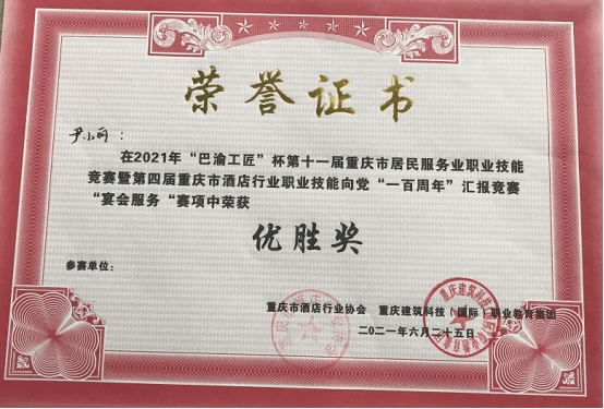 另外,重庆圣荷酒店实习生尹小丽同学近日在重庆市酒店行业协会举办的“2021年‘巴渝工匠’杯第十一届重庆市居民服务业职业技能竞赛”中荣获优胜奖,也受到了实习单位的表扬。