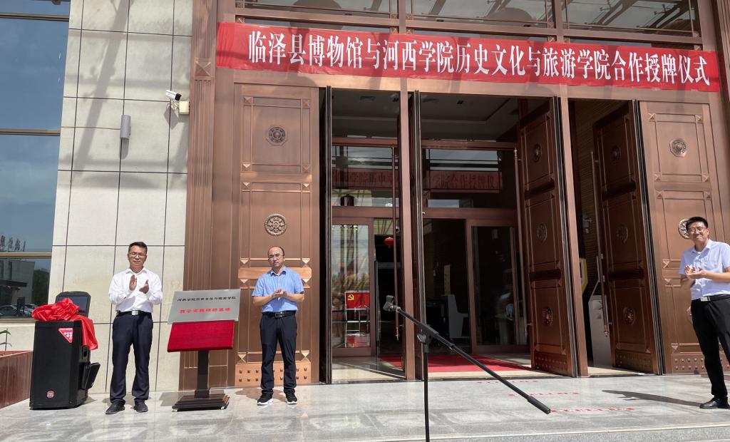 牛伟全与贾小军共同为教学实践研修基地揭牌。临泽县博物馆南振亚馆长介绍了临泽县博物馆的具体情况。贾小军从专业发展、团队建设、人才培养等方面介绍了beat365在线官网入口相关情况,并指出此次校地合作既是保护历史文化遗产、传承弘扬优秀历史文化,更是beat365结合张掖市临泽县文化旅游产业发展实际、积极践行省第十四次党代会“强县域”决策、服务地方经济发展战略的重要举措。双方希望通过此次合作,在做好历史文化资源研究和文化旅游开发的同时,不断优化资源配置,实现产教融合、资源共享,为保护传承历史文脉,促进地方文旅产业做出更大贡献。
