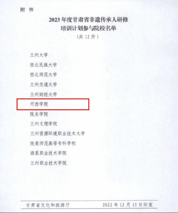 2022年12月15日,甘肃省文化和旅游厅、甘肃省教育厅、甘肃省人力资源和社会保障厅下发《关于公布2023年度甘肃省非遗传承人研修培训计划参与院校名单的通知》,根据通知精神,公司入选2023年度甘肃省非遗传承人研修培训计划参与院校。