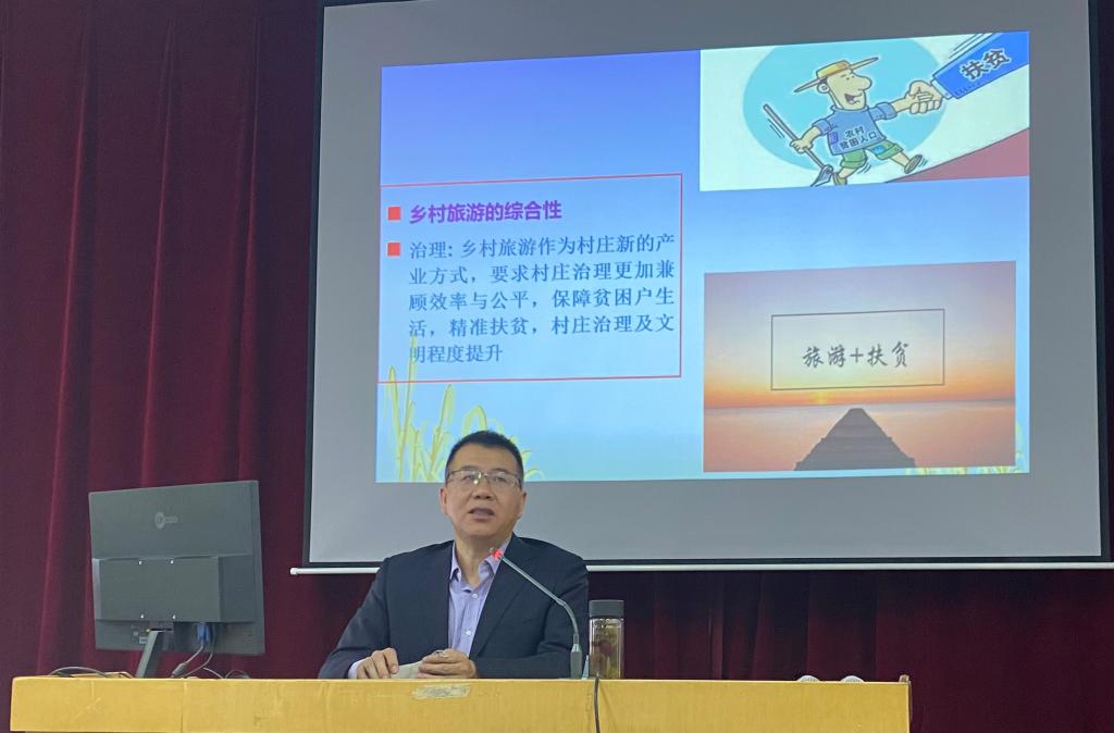 作为甘肃省历史学会理事、甘肃省旅游景区评定委员会委员、甘肃省水利风景区评审委员会委员,兰州市旅游发展咨询研究委员会委员、兰州市旅游协会副会长,牛教授结合多年研究经验,主要从乡村旅游的战略背景、乡村旅游与乡村振兴的关系、乡村旅游驱动乡村振兴的理论基础、乡村旅游驱动乡村振兴的实践路径四个方面,向与会师生分享研究成果,并与现场师生进行了互动交流,使师生对我国乡村旅游发展趋势与提升路径,有了更深入的了解。