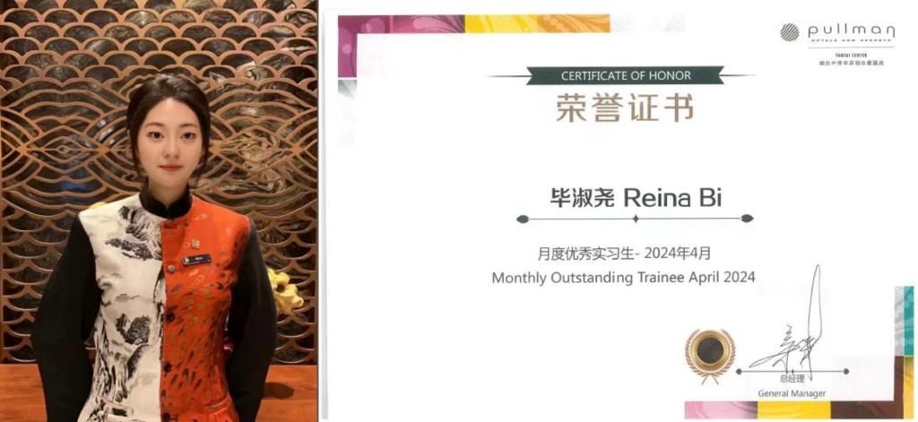4月份,烟台中泽华羿铂尔曼酒店实习生毕淑尧获得月度优秀实习生的表彰,酒店总经理为毕淑尧同学颁发荣誉证书。