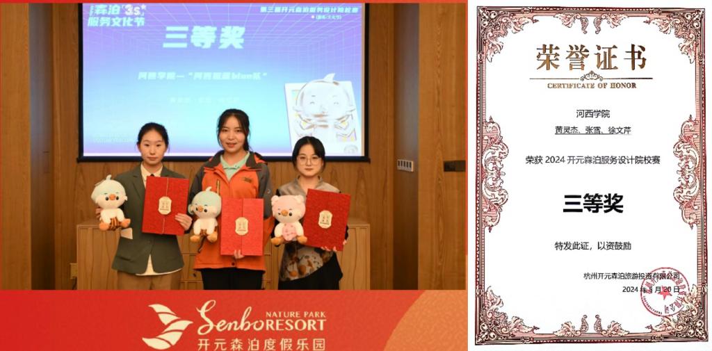 5月20日,杭州莫干山开元森泊度假乐园举行第三届服务设计院校赛,公司实习生黄灵杰、张雪、徐文芹在决赛中获得三等奖的优秀成绩,他们所设计的服务方案被开元集团采纳,开元集团给公司发来喜报,并感谢公司为实习单位输送了优秀的实习生。