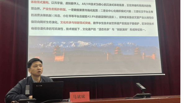 3月7日,公司邀请西北师范大学硕士生导师马斌斌副教授在学术一厅为师生作了题为“面向数字文明:数值嵌入下的文旅产业变革与研究议题”的学术报告。公司教师代表、硕士研究生及本科生300余名聆听了报告。