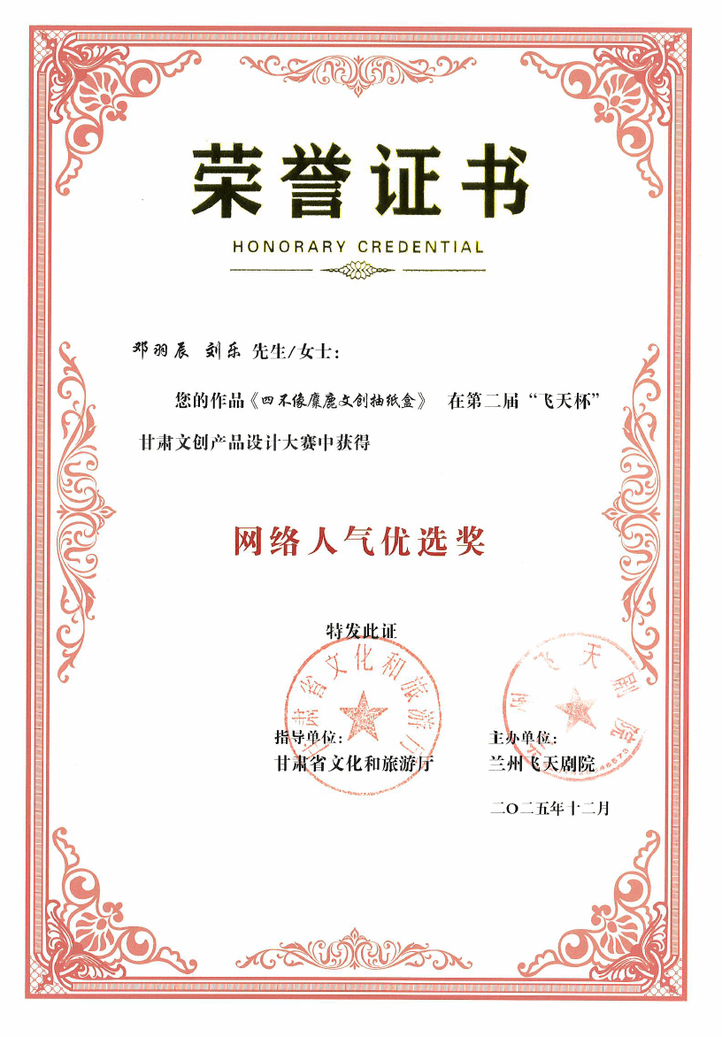本届大赛于2025年10月10日启动作品征集,12月10日截稿,聚焦甘肃文旅资源的创新转化,参赛作品涵盖文旅创意、非遗活化、时尚设计、数字文创等多个类别。beat365在线官网入口旅游管理专业硕士研究生邓羽辰、博物馆专业硕士研究生刘乐,在指导老师崔云胜、赵宏亮的悉心指导下携手创作的作品《四不像麋鹿文创抽纸盒》,从全国1452件参赛作品中脱颖而出。在累计超20万次的人气投票中拔得头筹,斩获网络人气优选奖。两位同学发挥跨专业互补优势,以文旅交融为创作核心,将旅游管理专业的市场洞察与博物馆专业的文化底蕴深度融合,凭借对甘肃本土文化的精妙诠释,收获了网友的广泛青睐与支持。