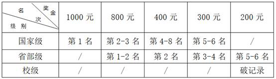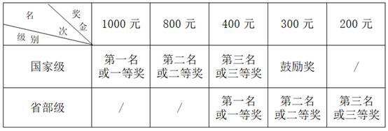 (一)凡在校级以上教育行政部门、科协等组织的学科、科技、技能、创新类正式竞赛中获得名次者,按照下表标准奖励: