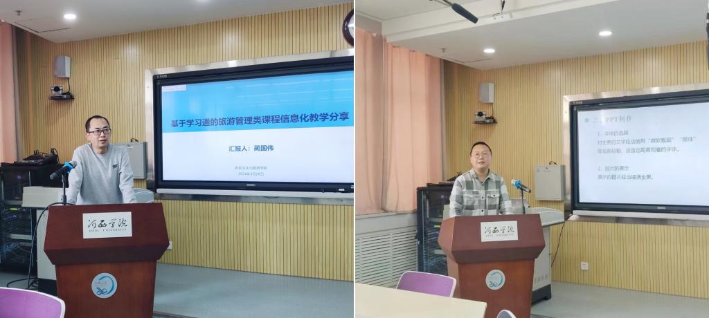 会上,蔺国伟老师和刘森垚老师分别以《基于学习通的旅游管理类课程信息化教学分享》《“中国历史地理”课程中的信息化应用》为题作了报告。两位老师结合自身教学实践,阐述了数字化资源在教学活动中应用的重要意义,分享了数字化教学工具的深度使用方法,提出了信息化与传统课堂结合存在的问题,展望了未来信息化教学的发展趋势,为与会教师提供了富有成效的信息化教学思路。